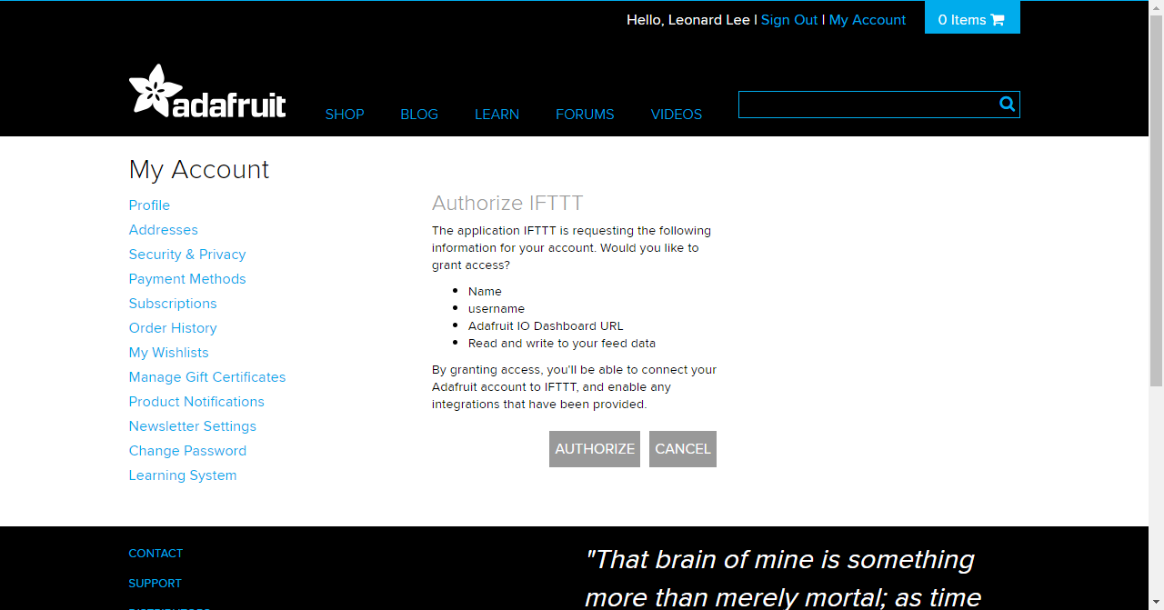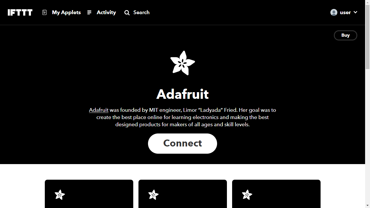 Go to https://ifttt.com/adafruit to connect IFTTT to Adafruit IO