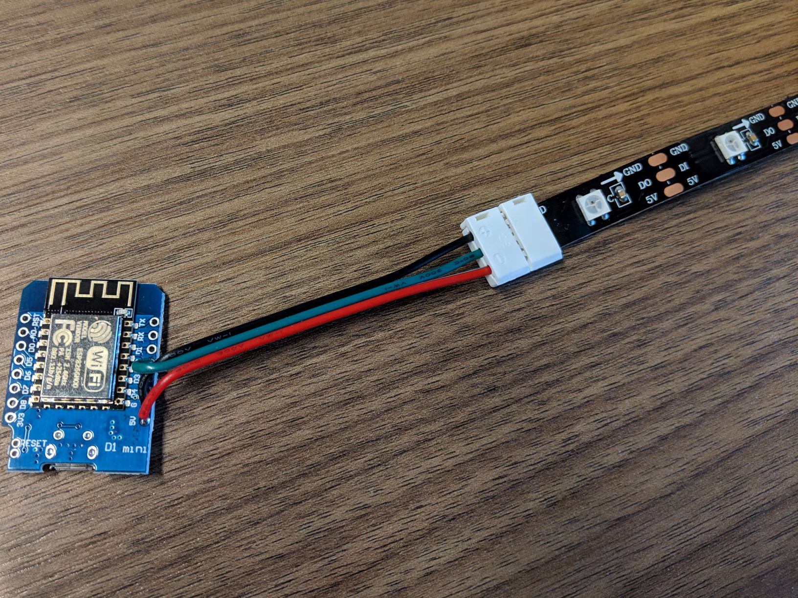 * According to the WS2812B datasheet, the minimum voltage for highs on the data input signal ought to be 0.7×VDD or 3.5V with a 5V power supply. However, this setup still works because it's close enough? ¯\_(ツ)_/¯ You can try to avoid flickering issues by using a power supply that is no greater than 5V (some go to 5.25V).